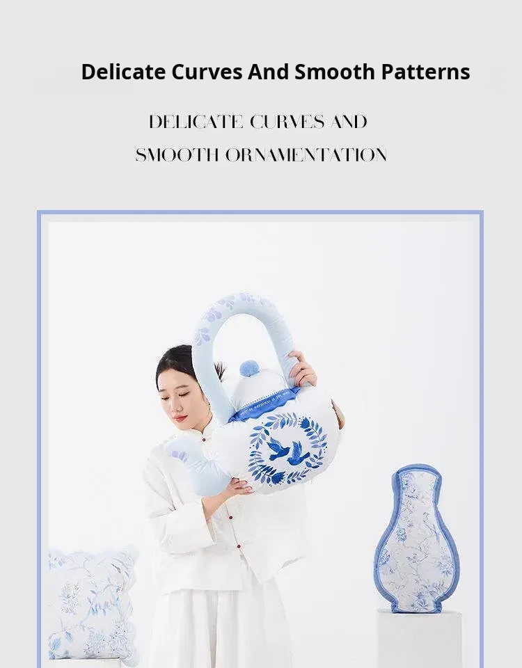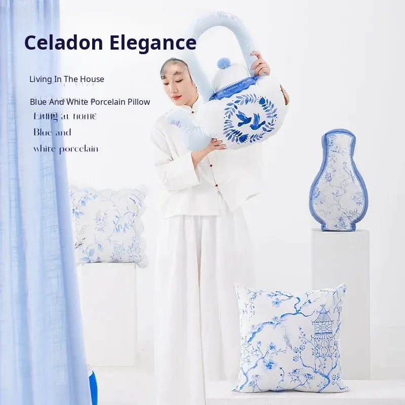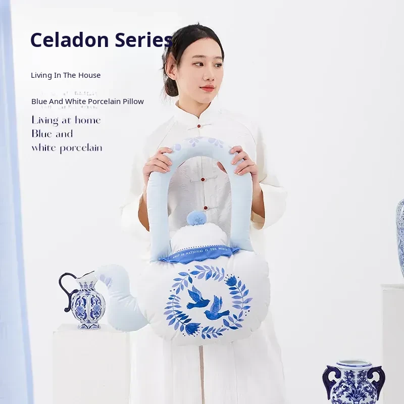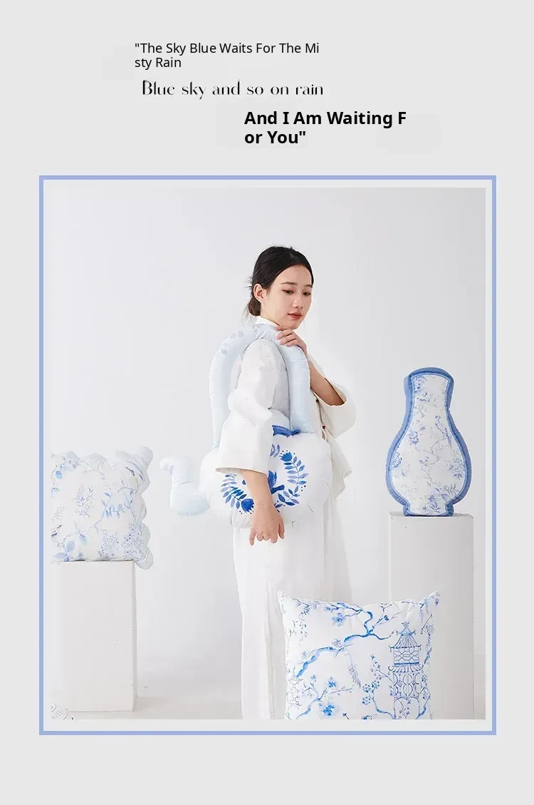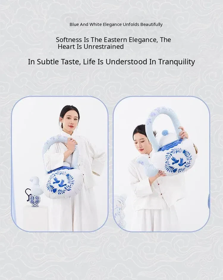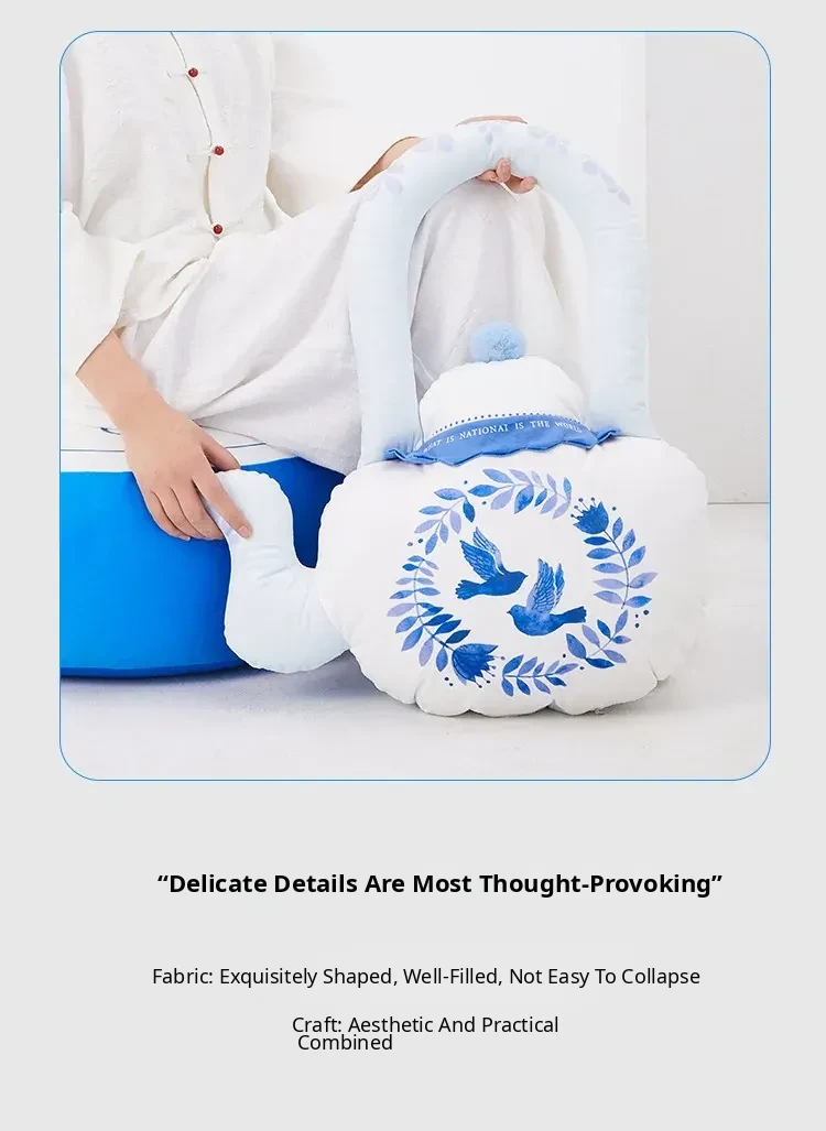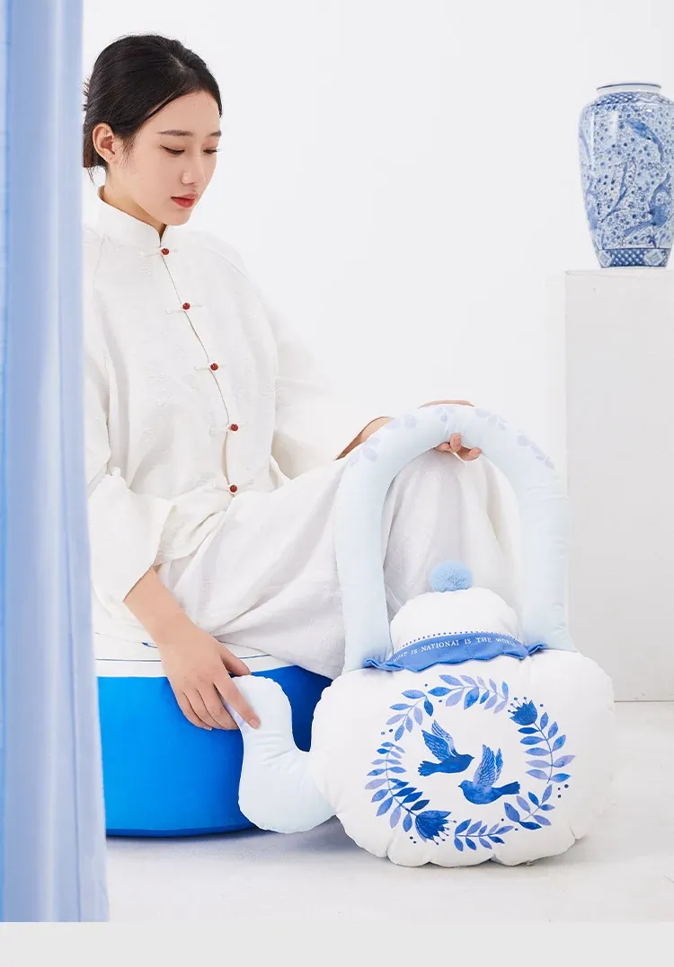 Creative Chinese-Style Palace Teapot Pillow with Unique Sofa Backrest Design - Blue and White Porcelain Waist Cushion Art Pillow Cover