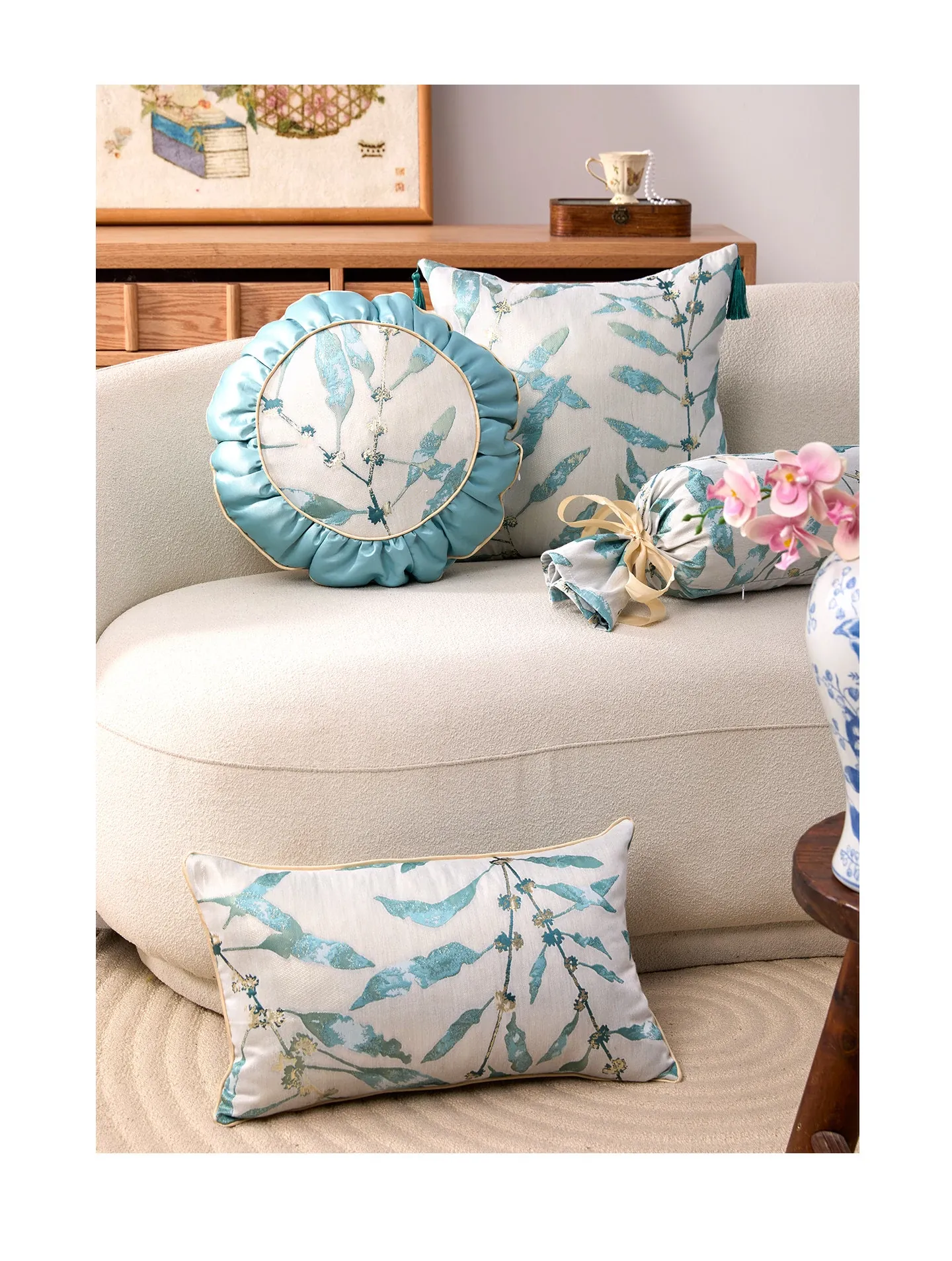 Elegant New Chinese Style Long Rectangle Throw Pillow with Round Tassels for Sofa - Luxurious and Chic Decorative Cushion Cover for Your Living Room