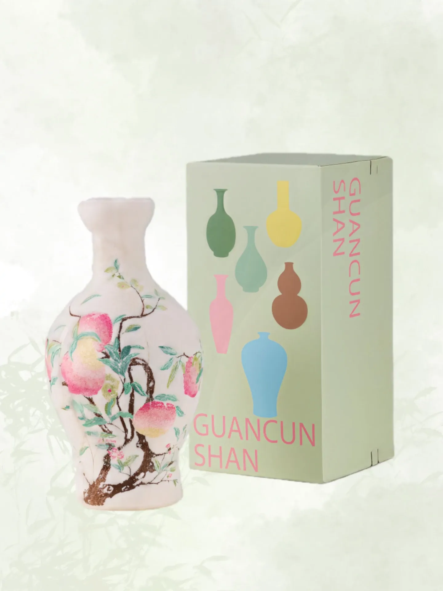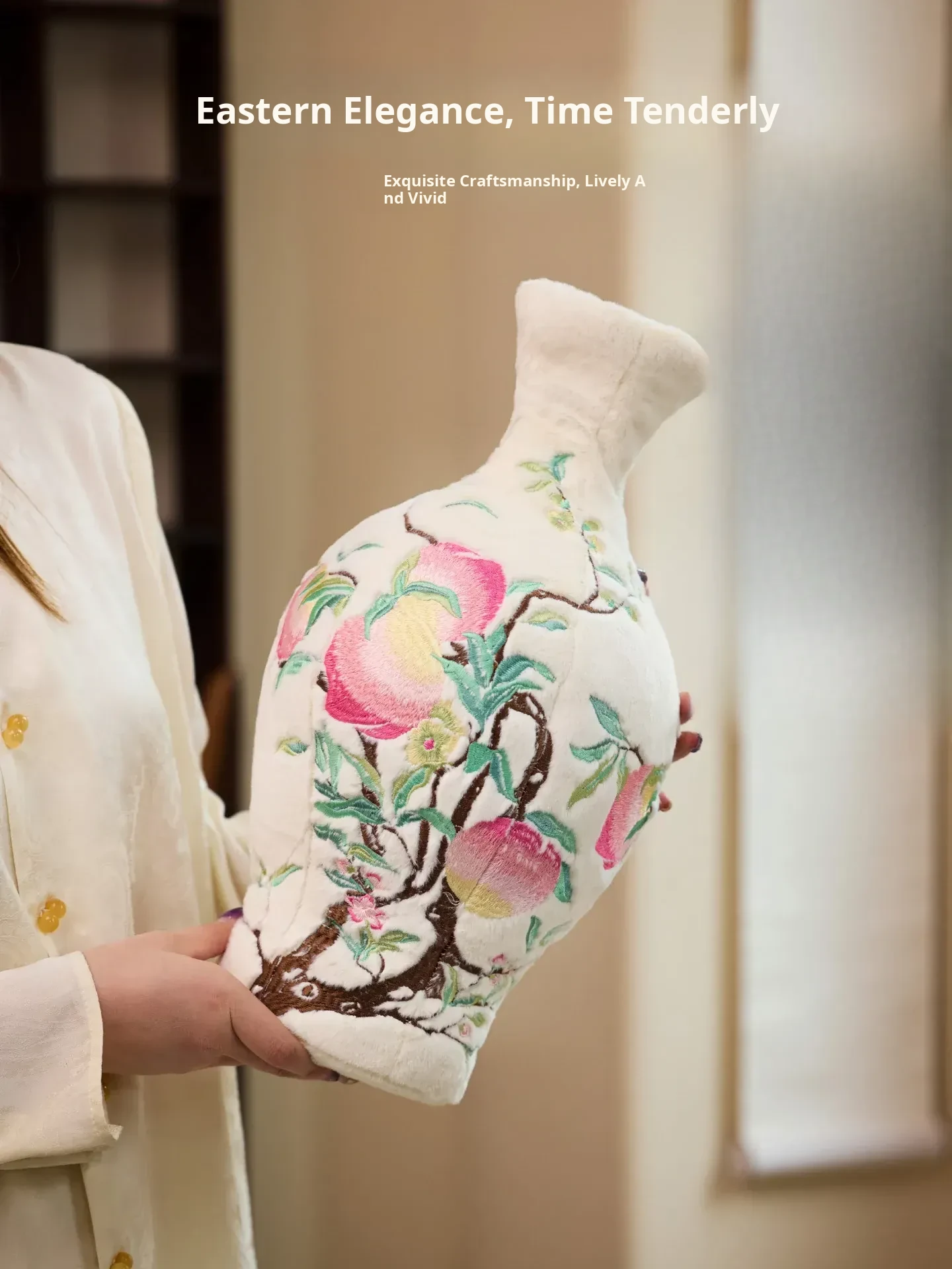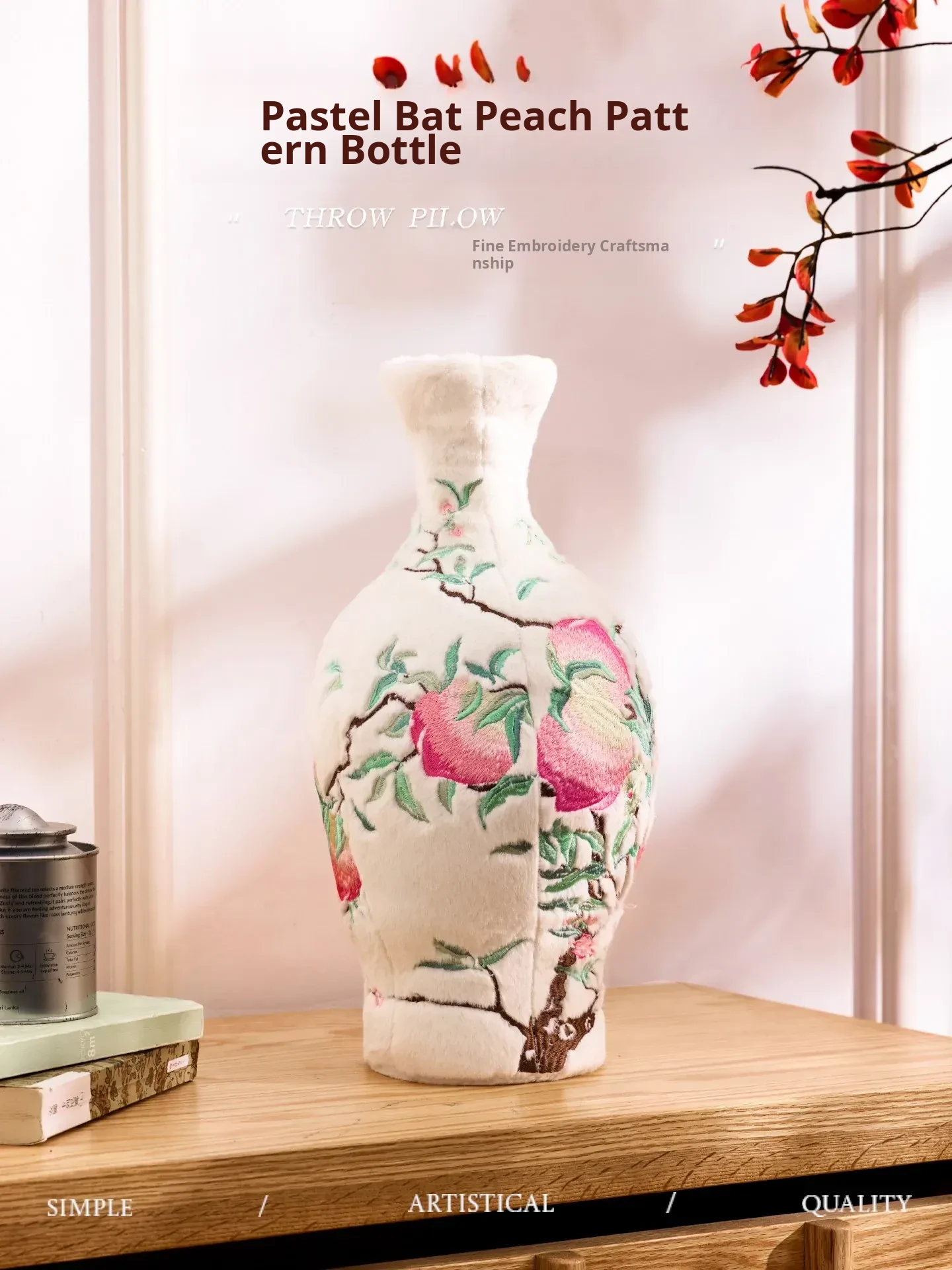 Pastel Bat and Peach Pattern Bottle Velvet Porcelain Embroidery Pillow Ornament + Gift Box (Bottle Diameter 20*Height 39)