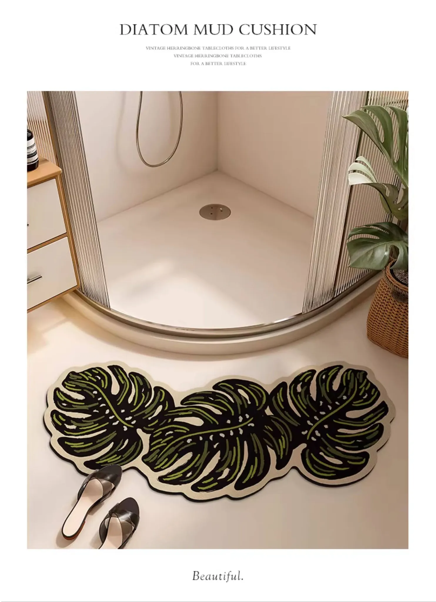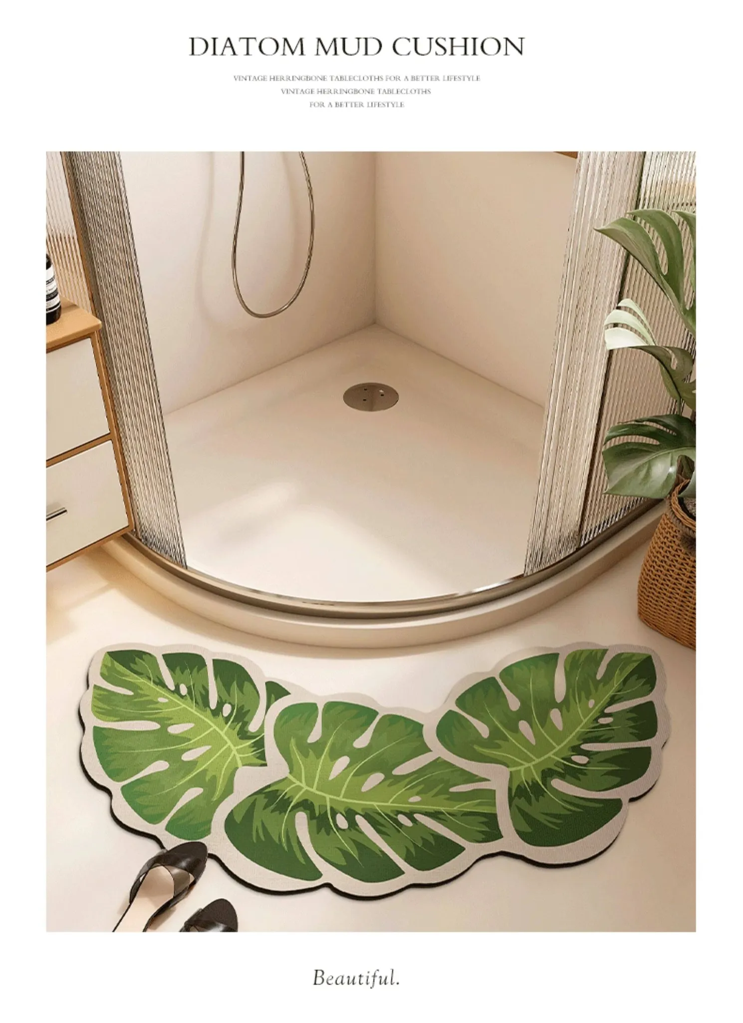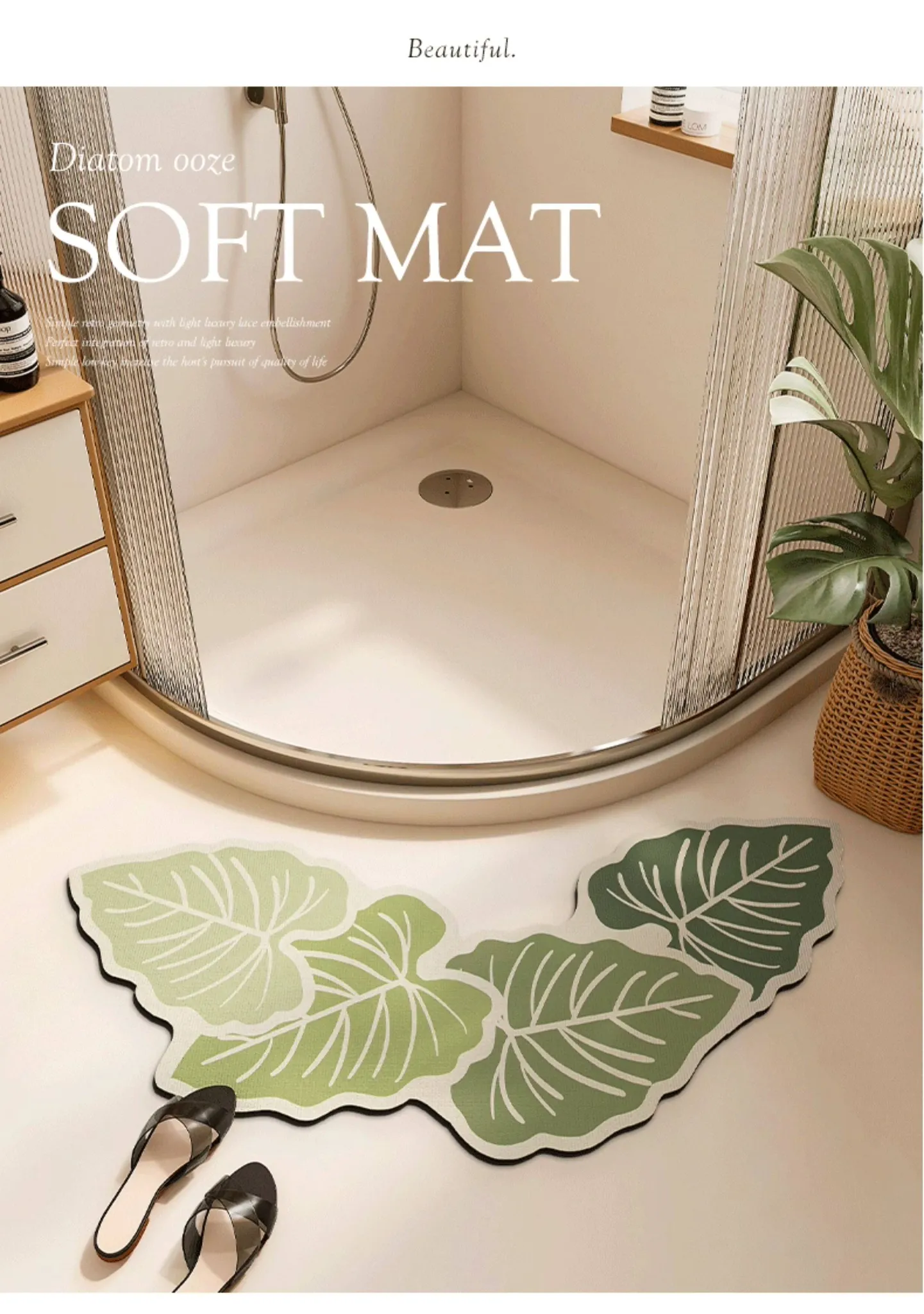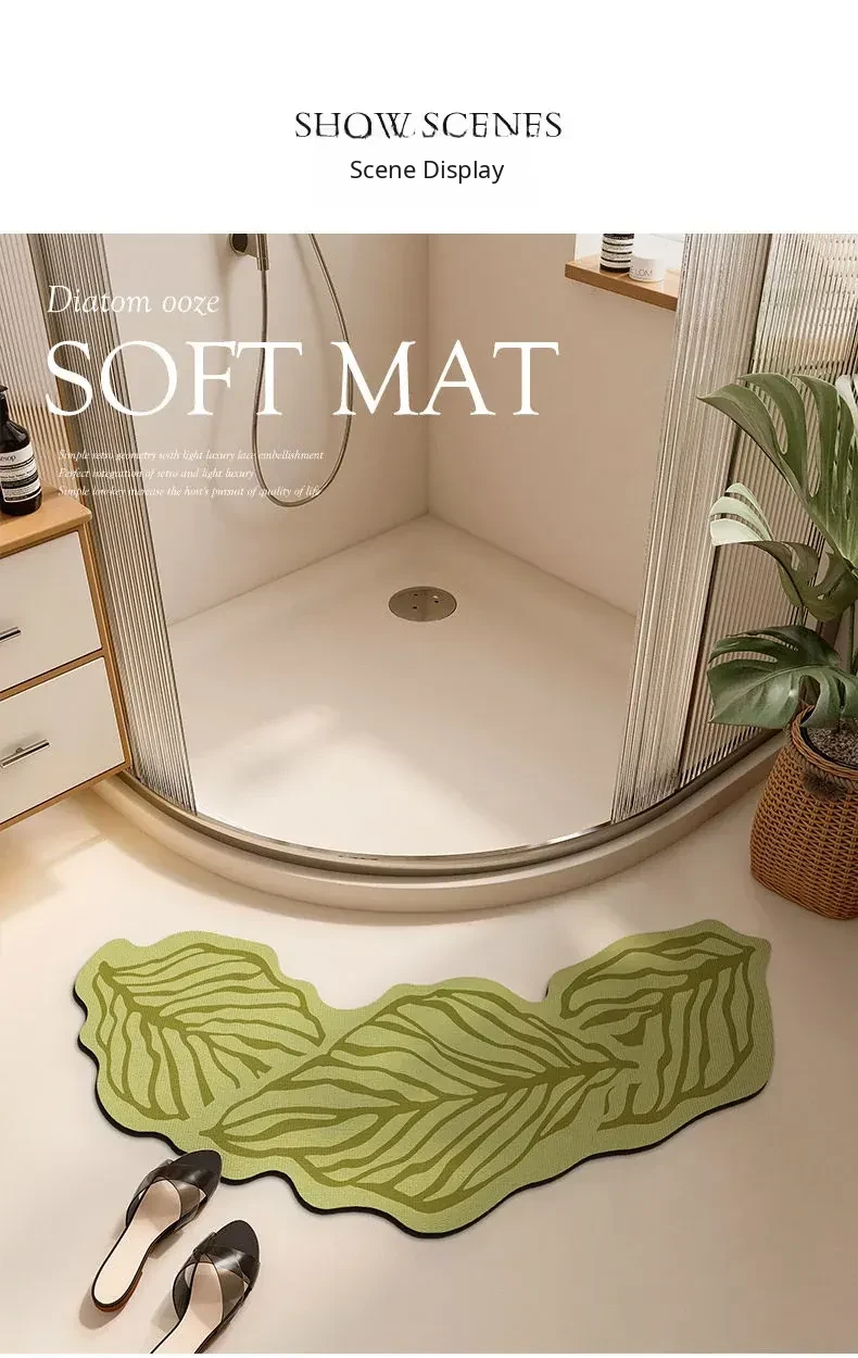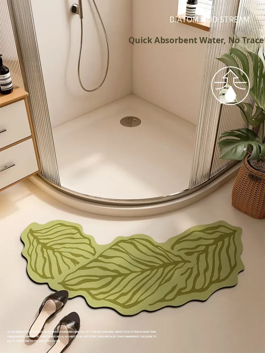 Green Leaf Rain Sound Diatomaceous Earth Bath Mat - Curved/Asyinetrical Shape