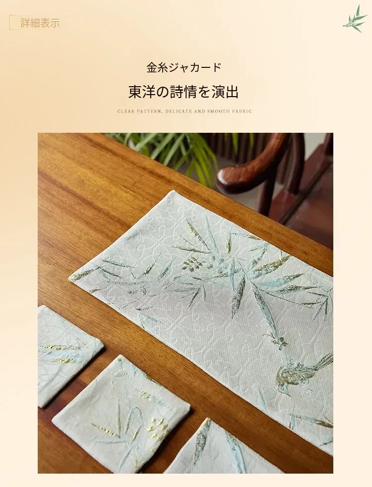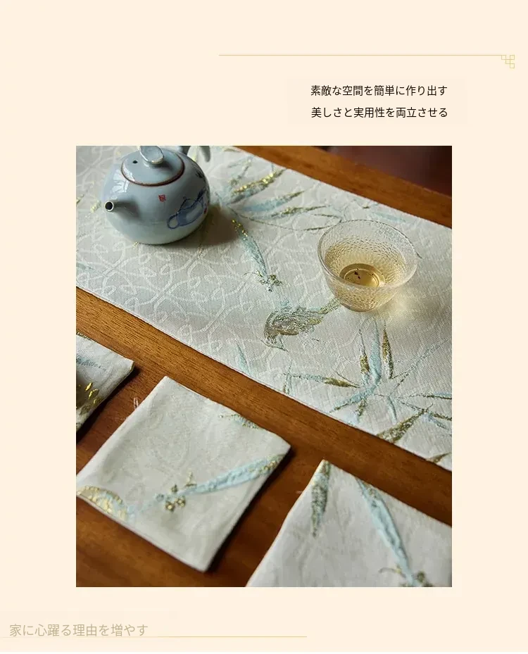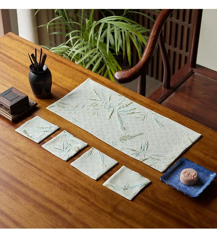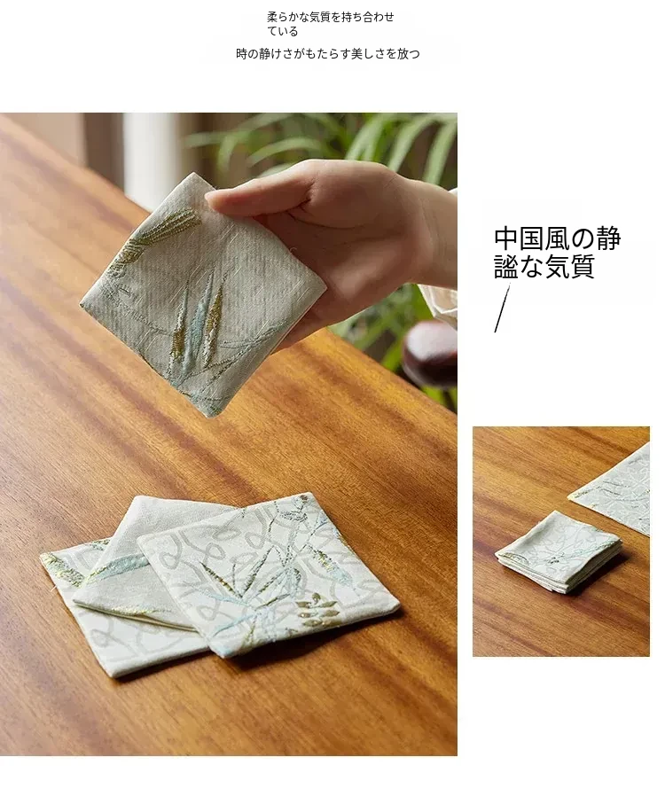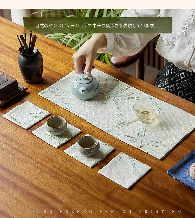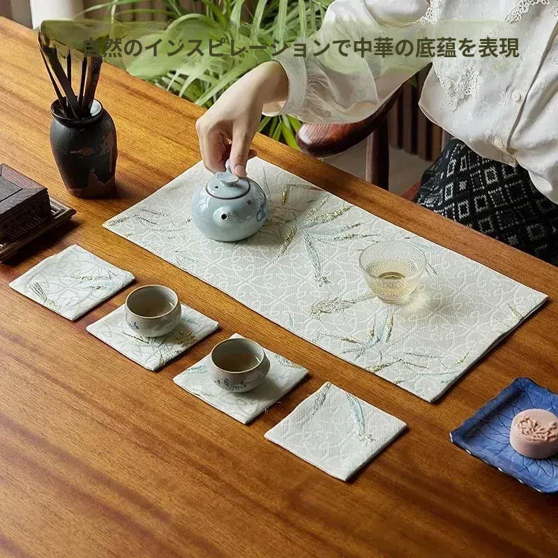 新中式乾燥式茶席用テーブルクロス - 禅の雰囲気漂う刺繍デザイン!防水・断熱機能付き、ティータイムを優雅に演出する茶卓布と茶巾、さらにおしゃれなコースターも完備。あなたの茶の時間を特別に!