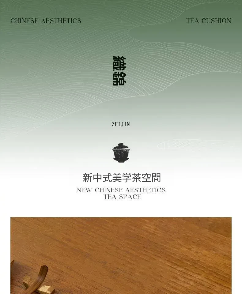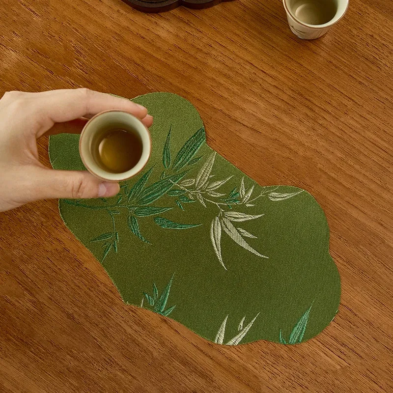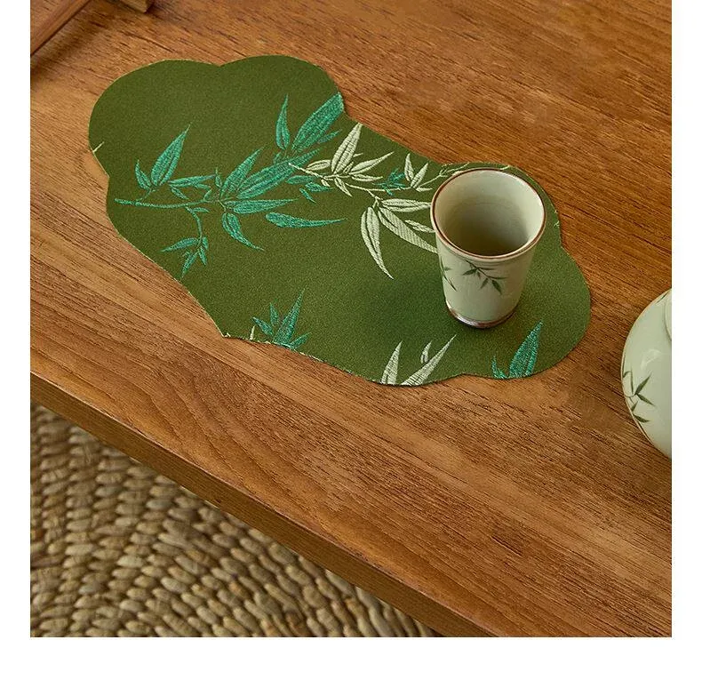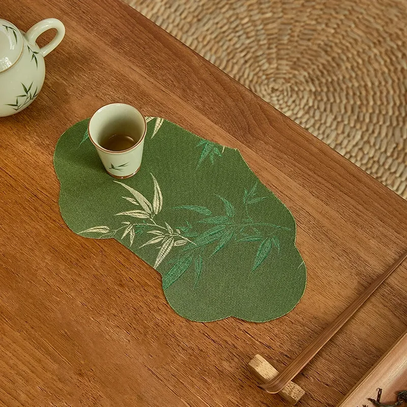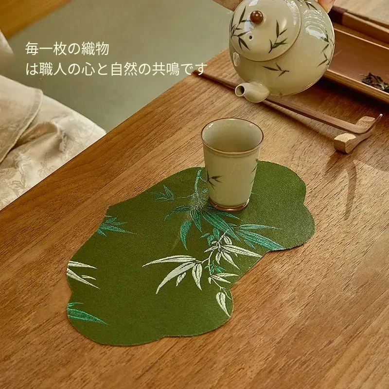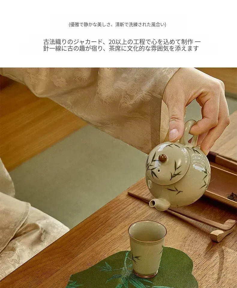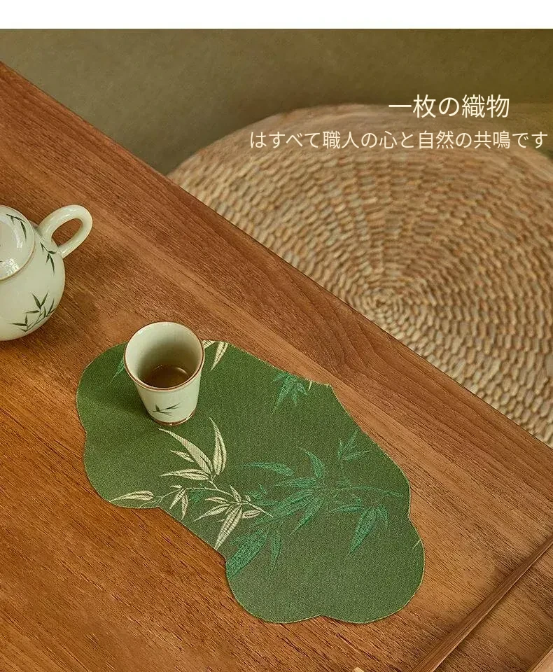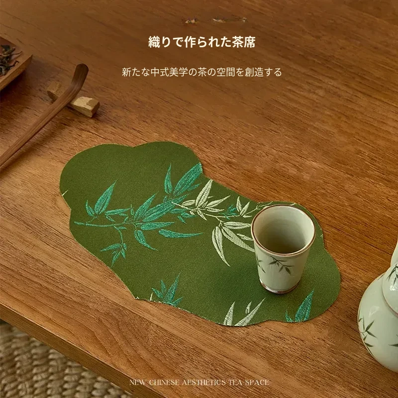 新中式グリーン織物茶席テーブルマット - 禅の心を感じるシンプルデザイン!防水機能付きでお手入れ簡単、茶道をもっと楽しむための必需品です。