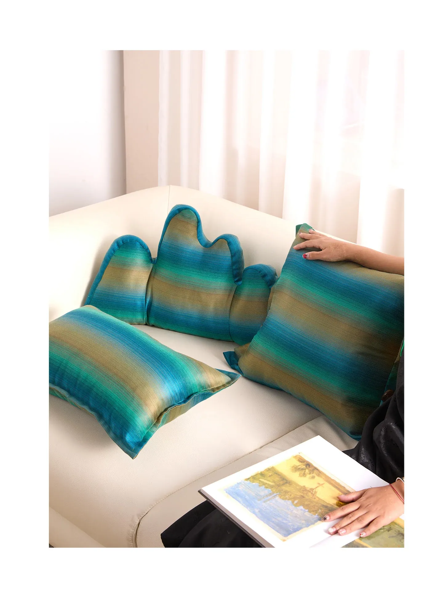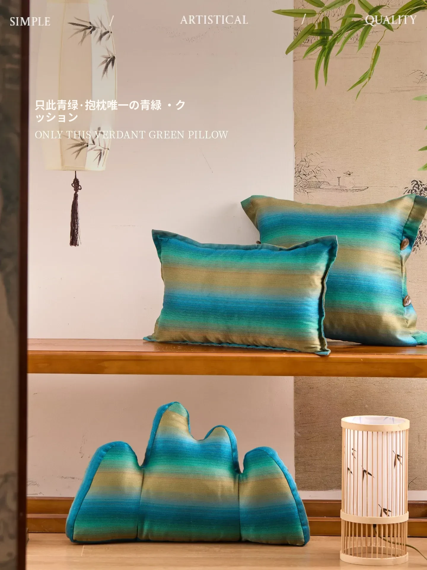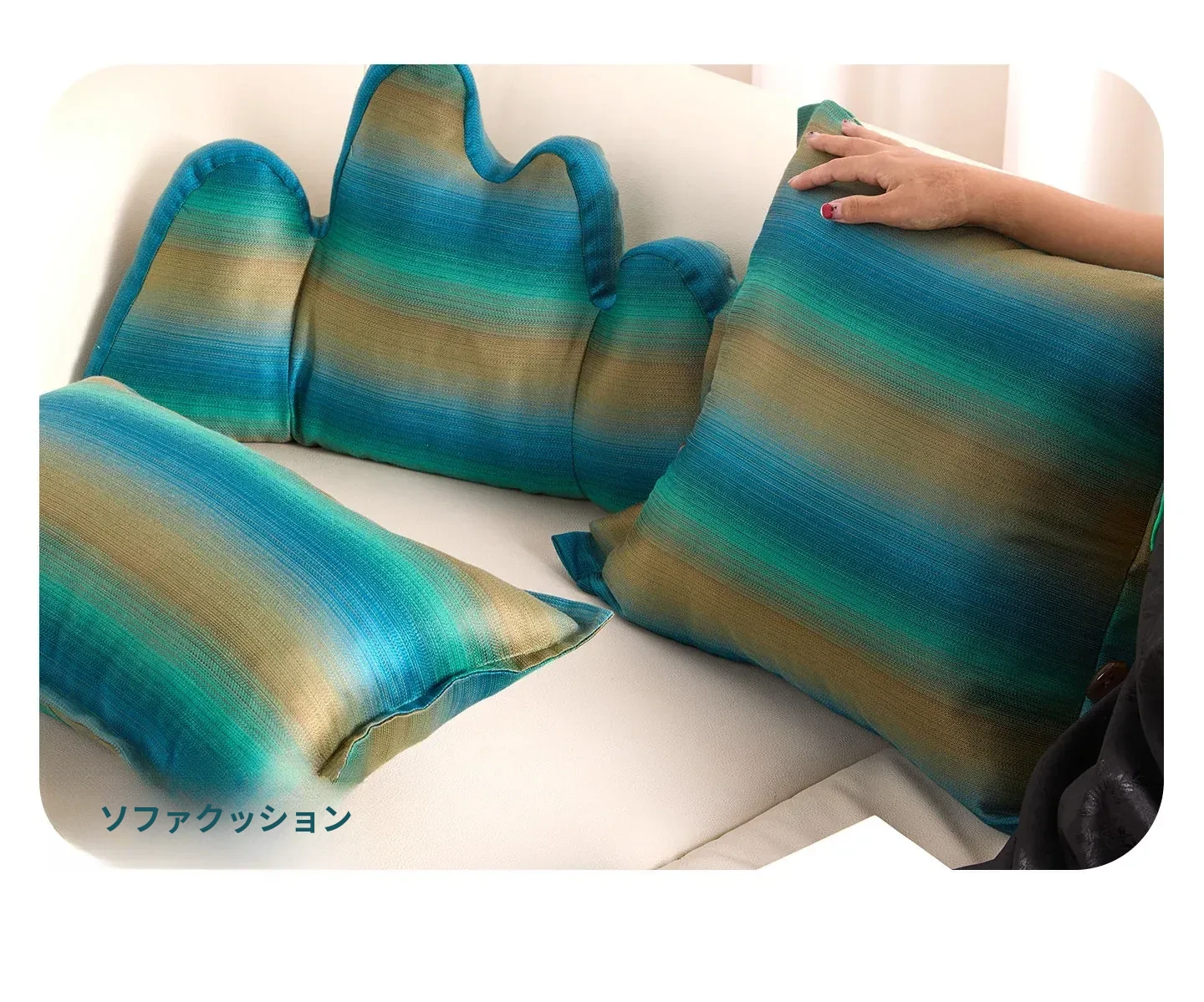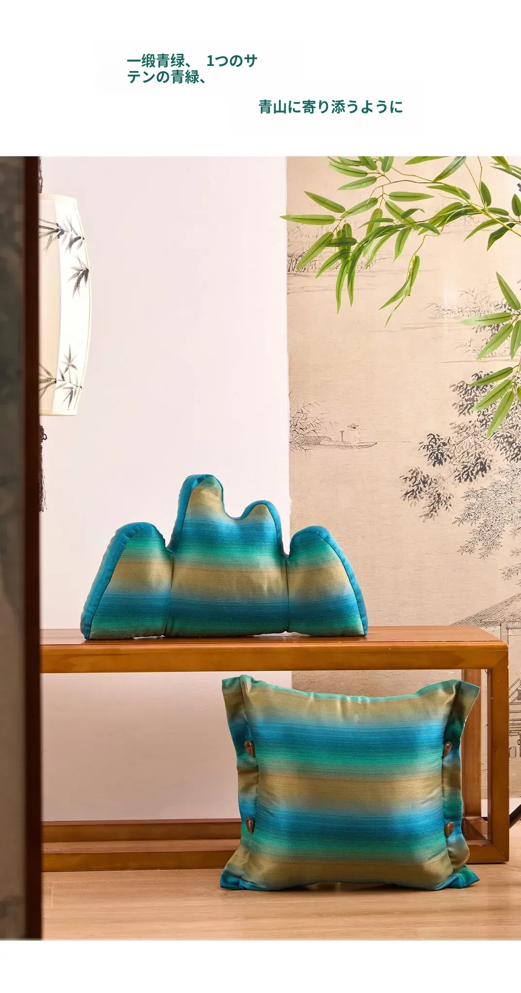 新中式デザインの緑の山型クッション - 高級感あふれるリビングやオフィスにぴったりの多機能サポートクッション。おしゃれなソファや椅子に彩りを加え、心地よいひとときを演出します。