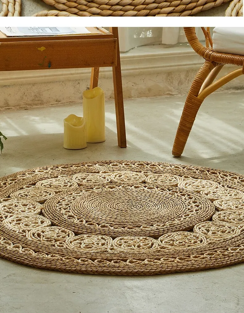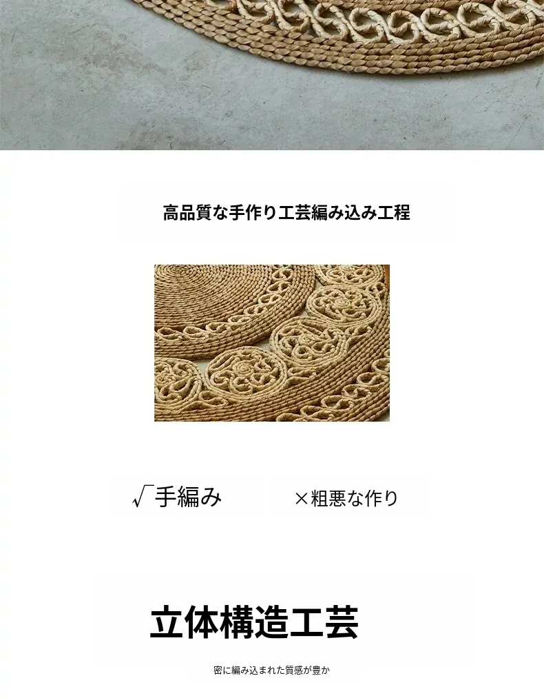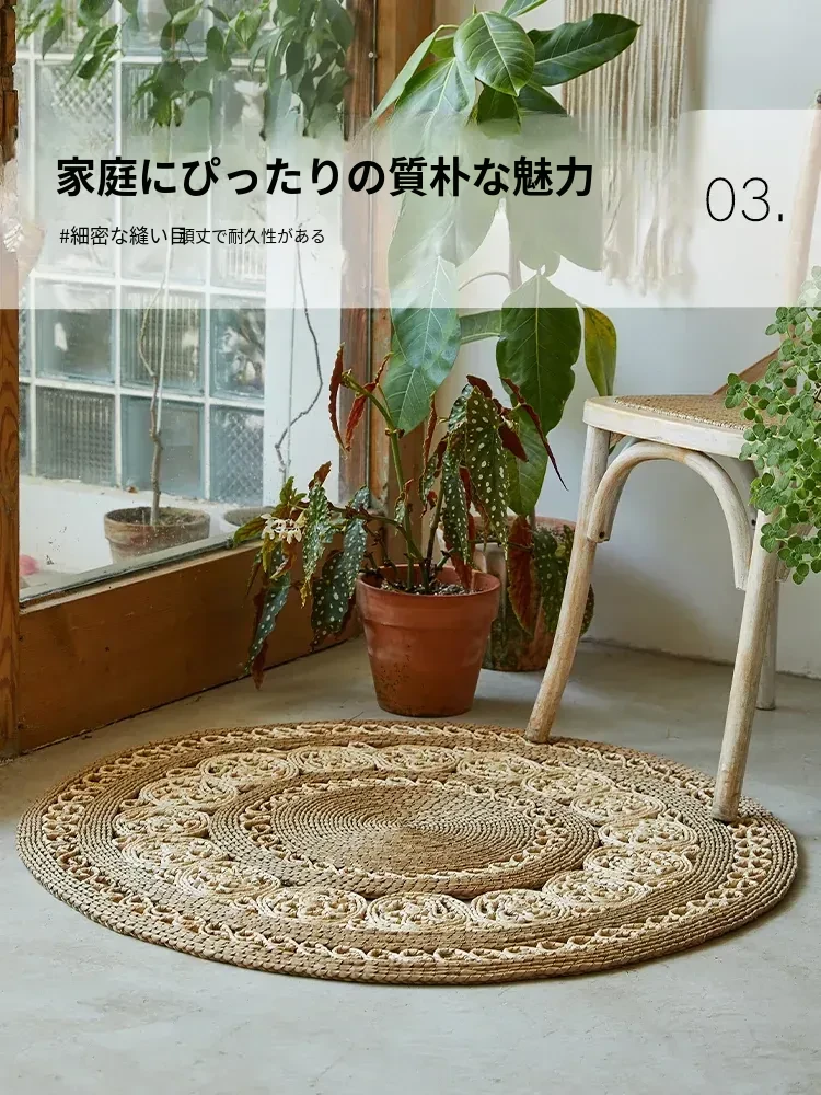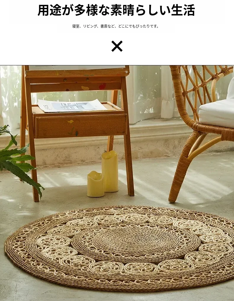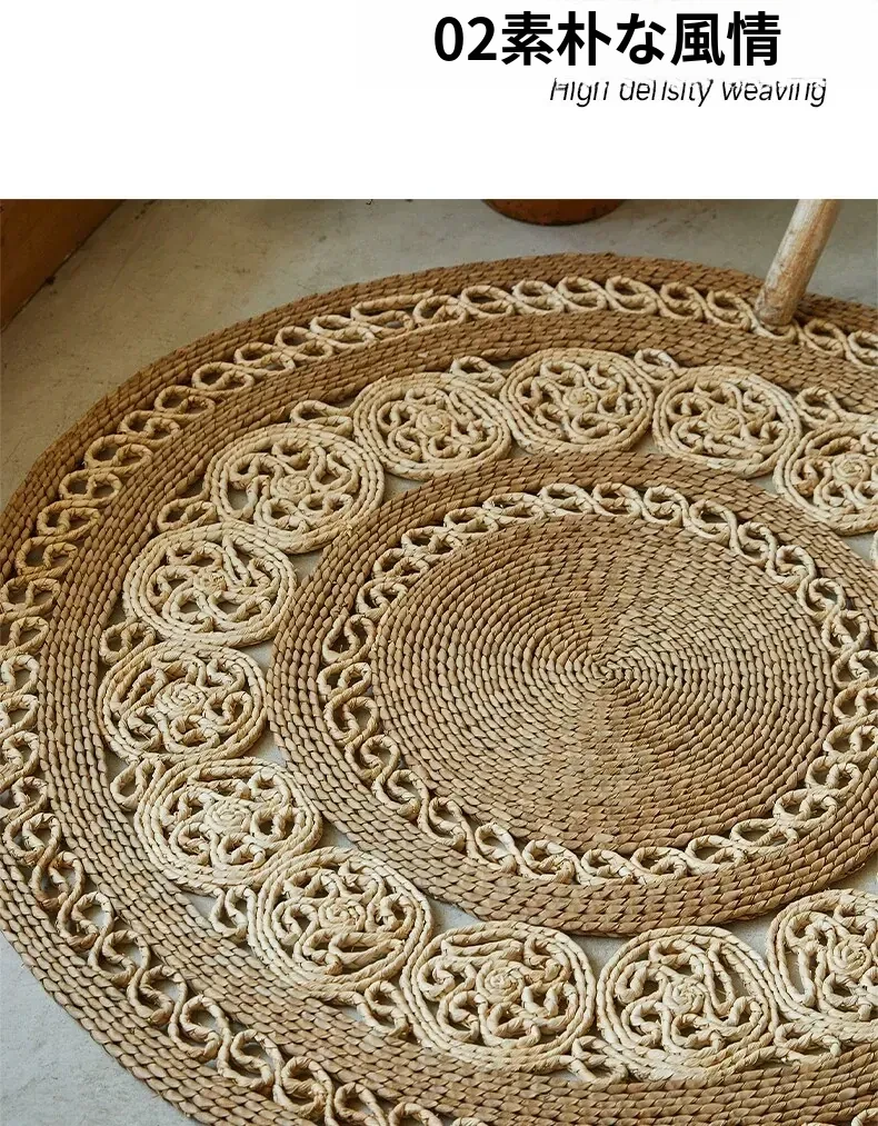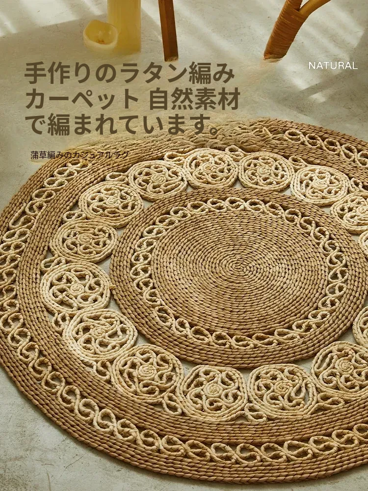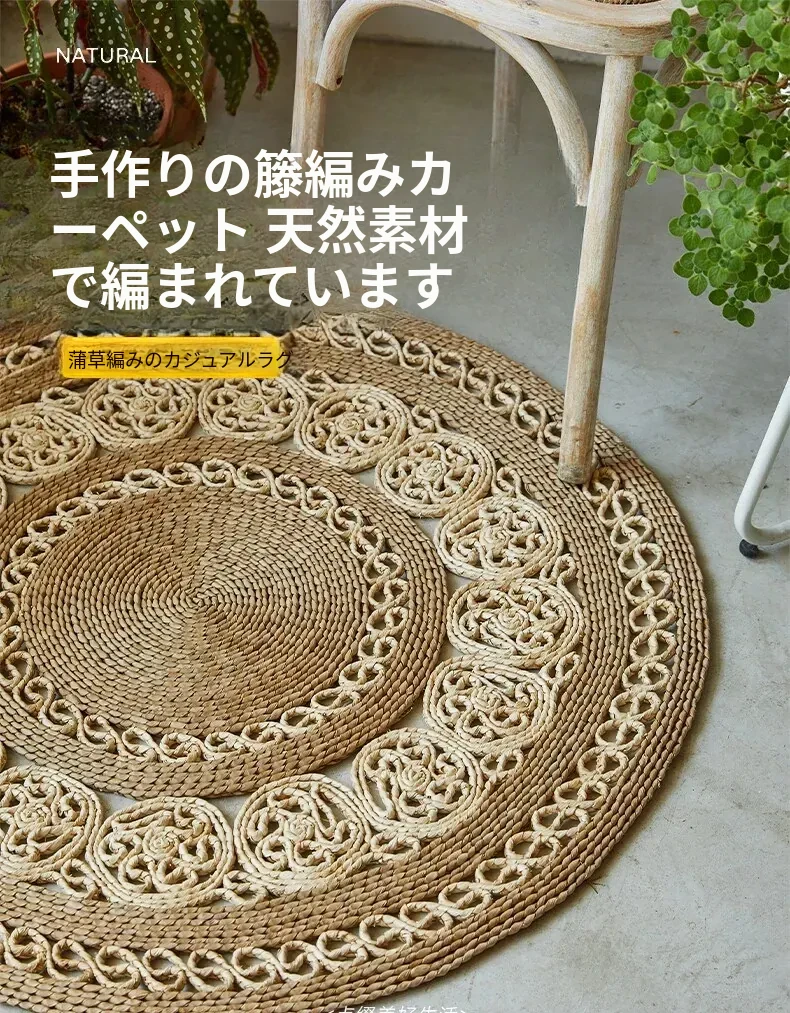 手作草編円形ラグマット - 水草を使用したおしゃれなデザイン!リビングや寝室にぴったりの天然素材のラグ。民宿や服飾店のデコレーションにも最適な、温かみのある雰囲気を演出します。