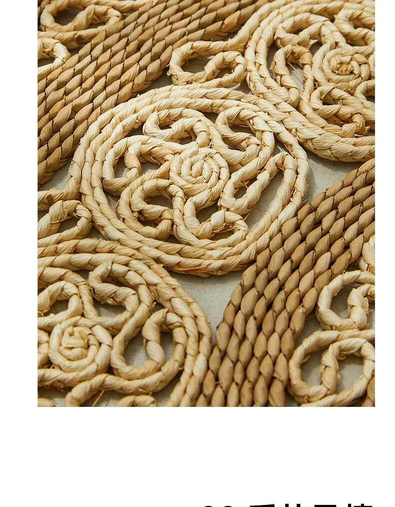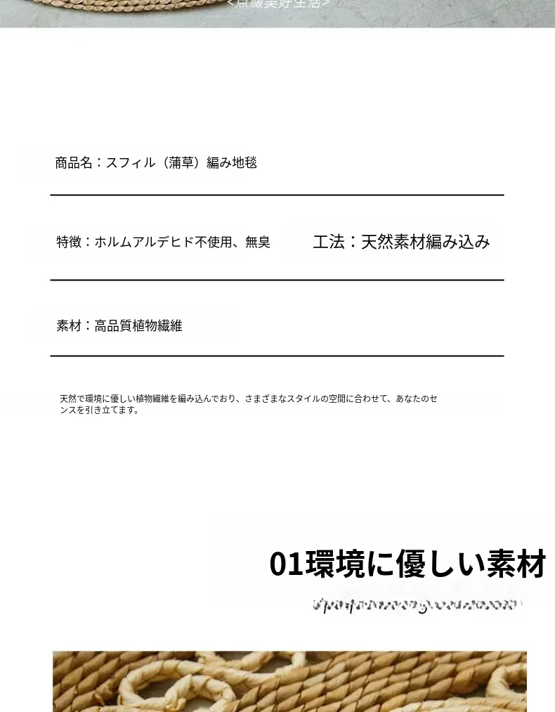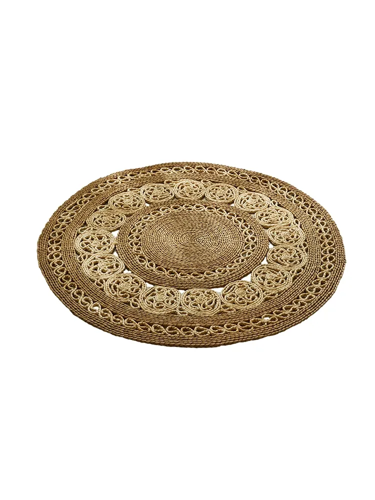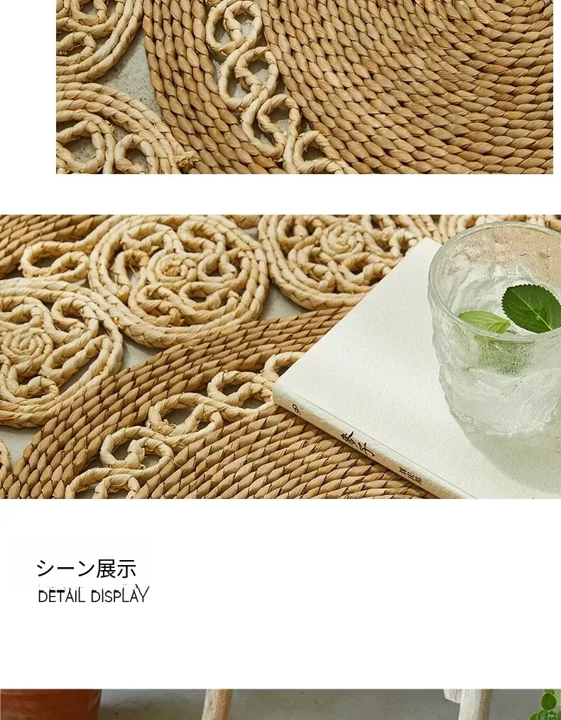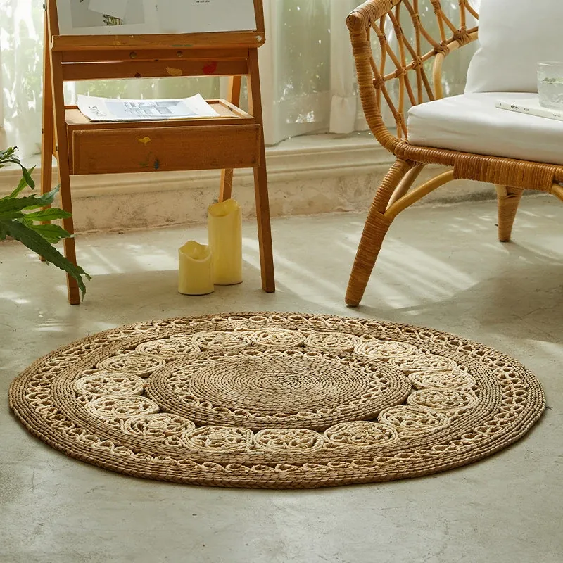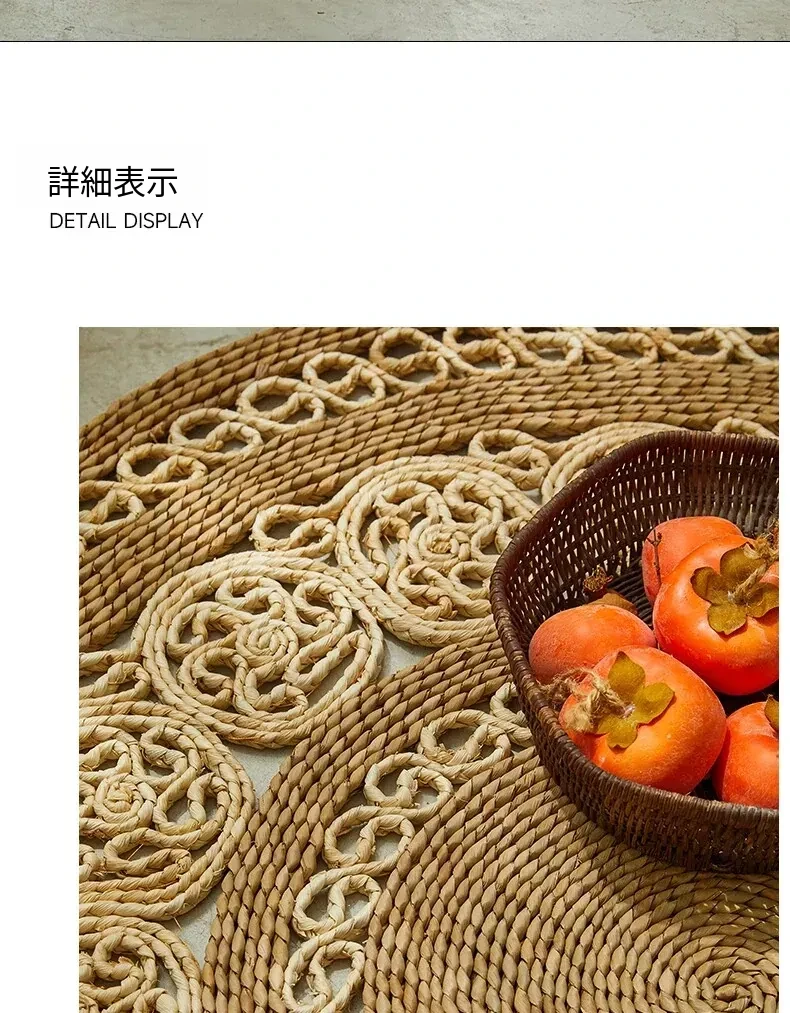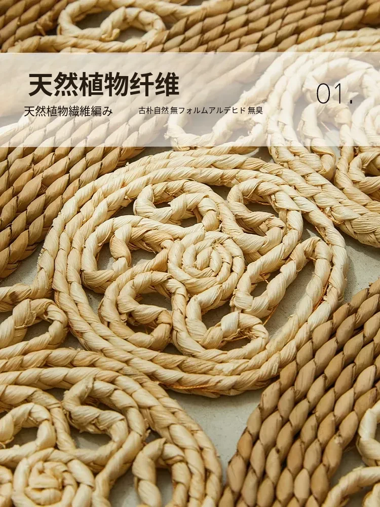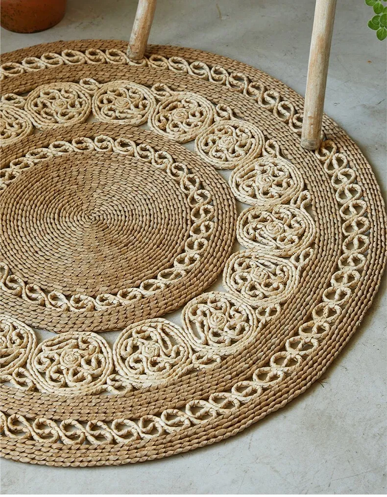 手作草編円形ラグマット - 水草を使用したおしゃれなデザイン!リビングや寝室にぴったりの天然素材のラグ。民宿や服飾店のデコレーションにも最適な、温かみのある雰囲気を演出します。