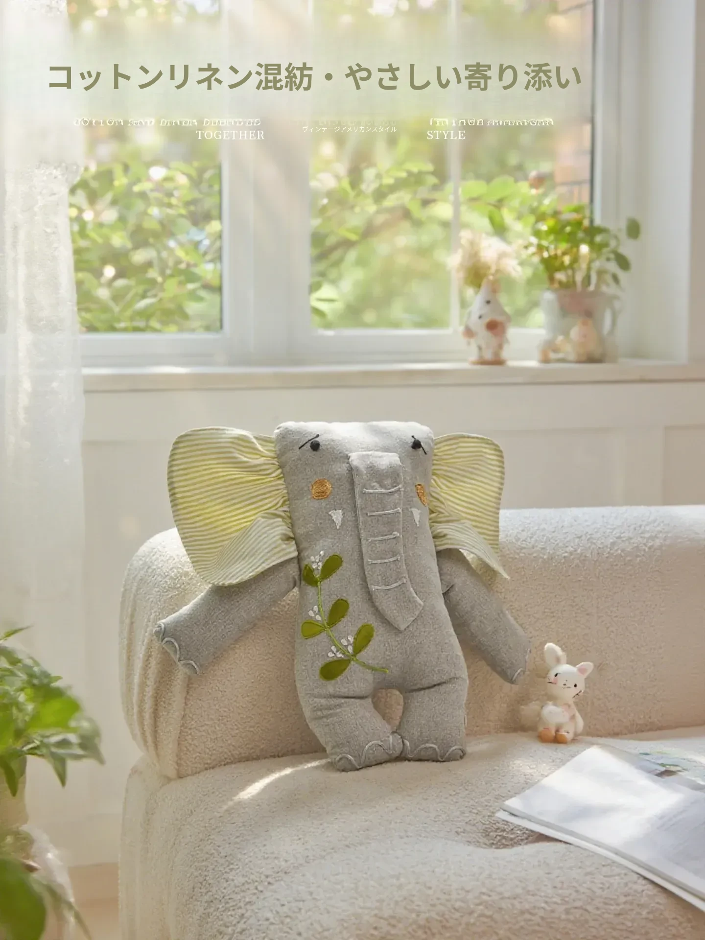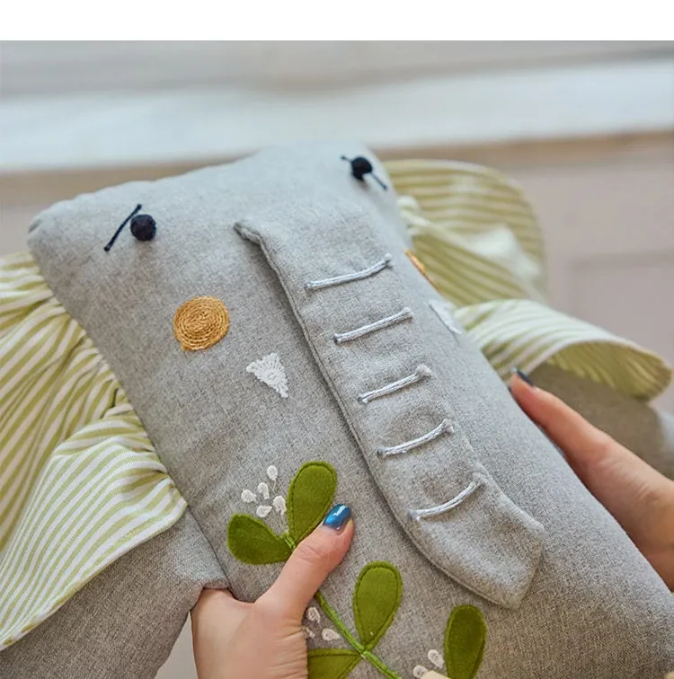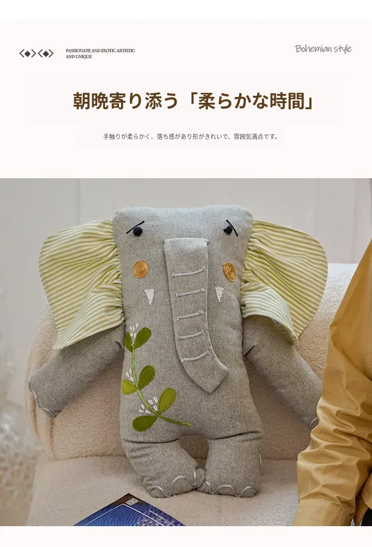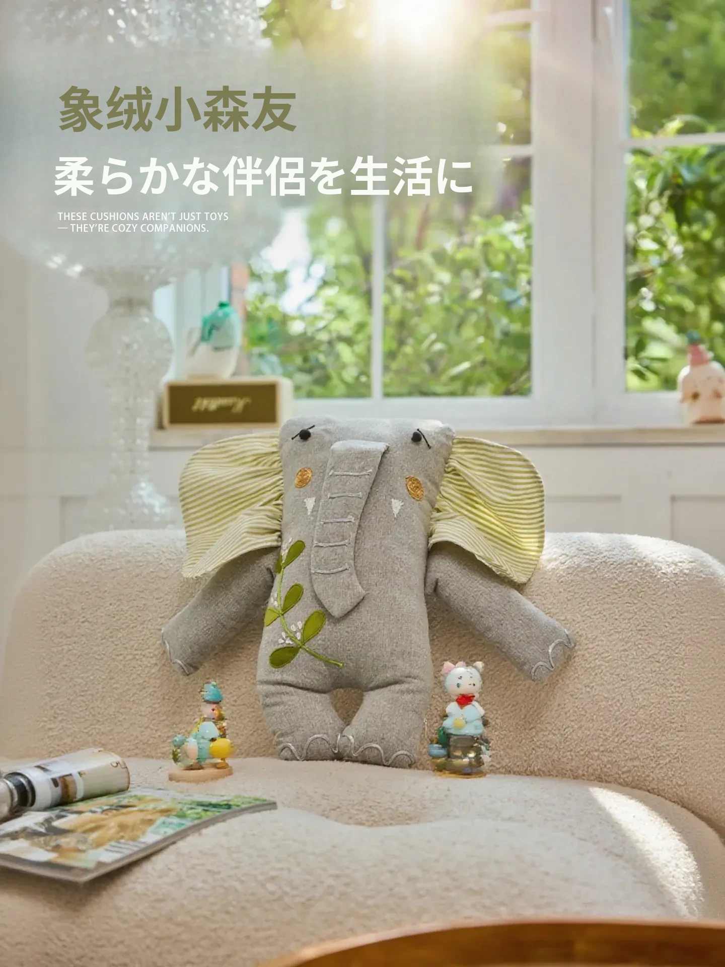 癒し系グレーの象ぬいぐるみクッションカバー - 刺繍入り、リビングやソファにぴったり!おしゃれな雰囲気を演出する腰枕兼背もたれ。心地よい癒しをあなたの空間に。