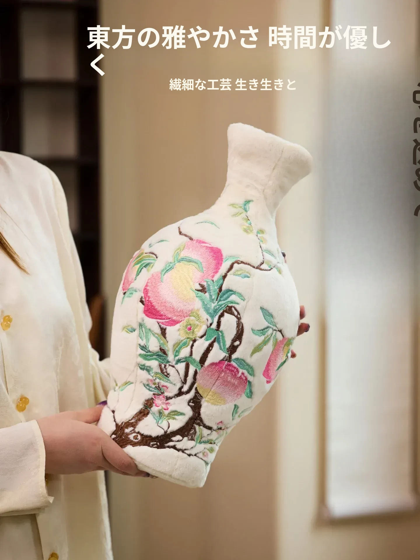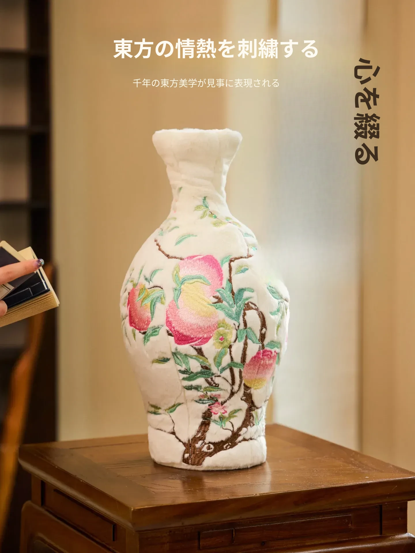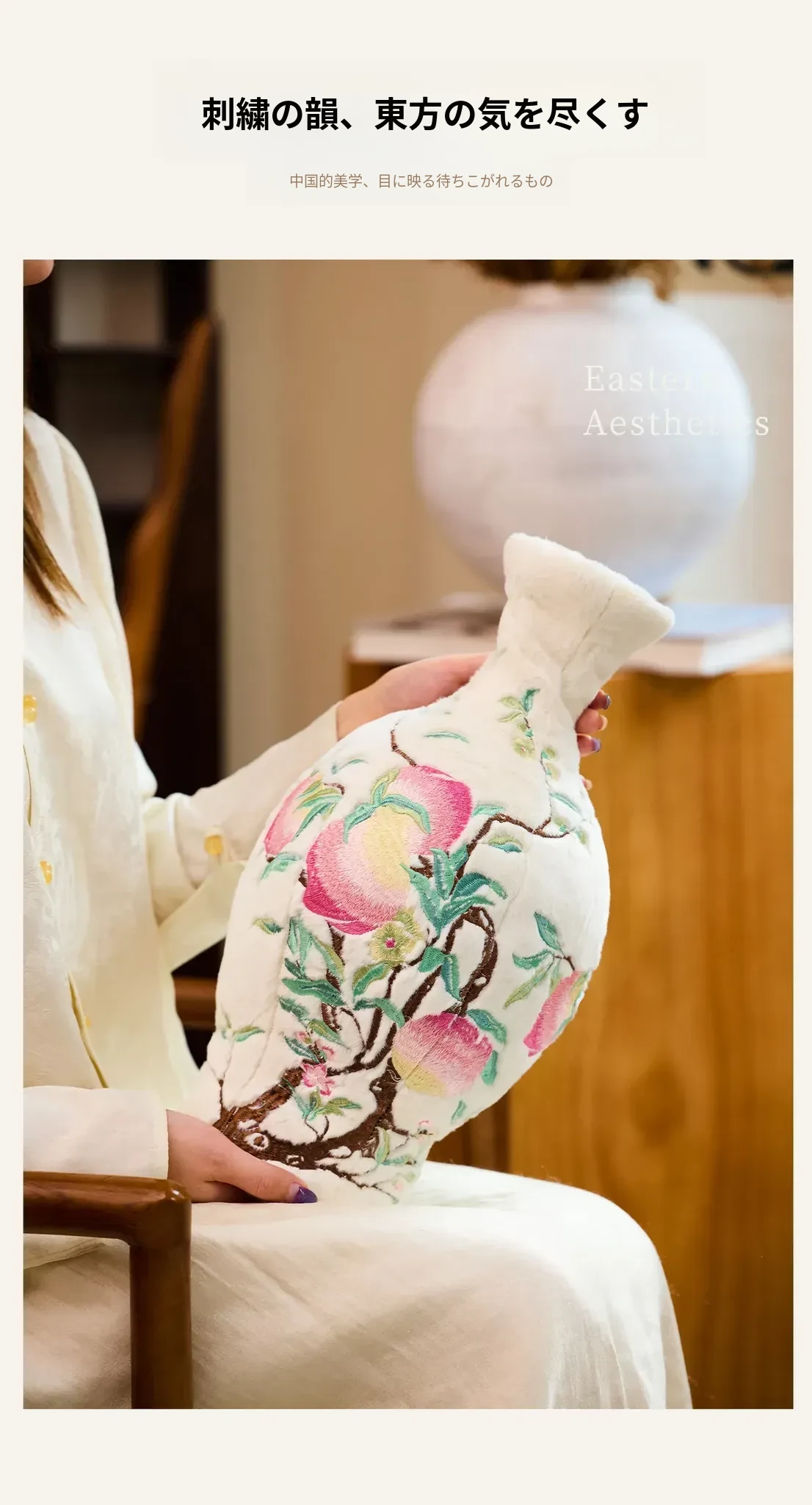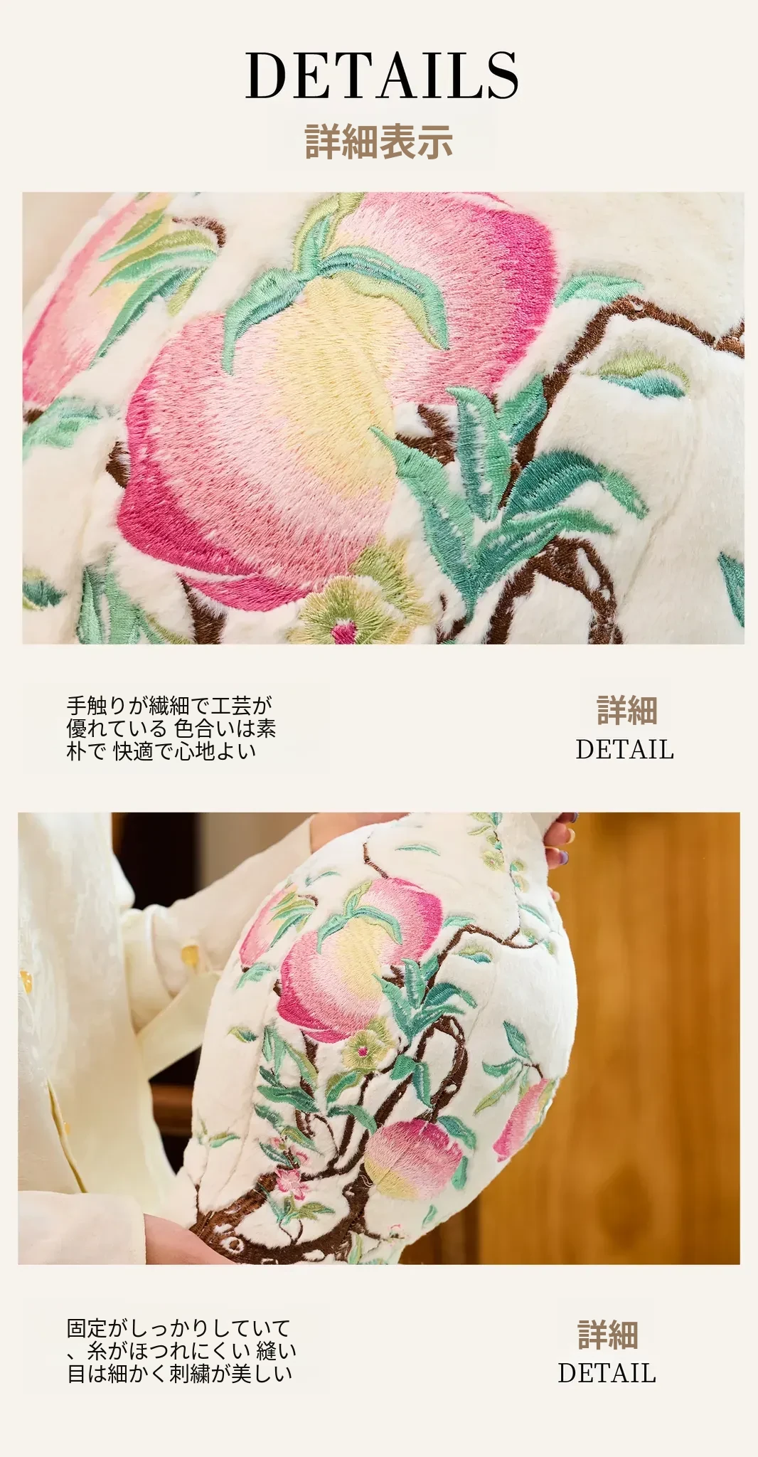 新中式蝠桃デザインの刺繍クッション、創造的な花瓶と背もたれクッションのセット – リビングや寝室にぴったりの中国風文創ギフトアイテム!おしゃれで温かみのある空間作りに最適です。