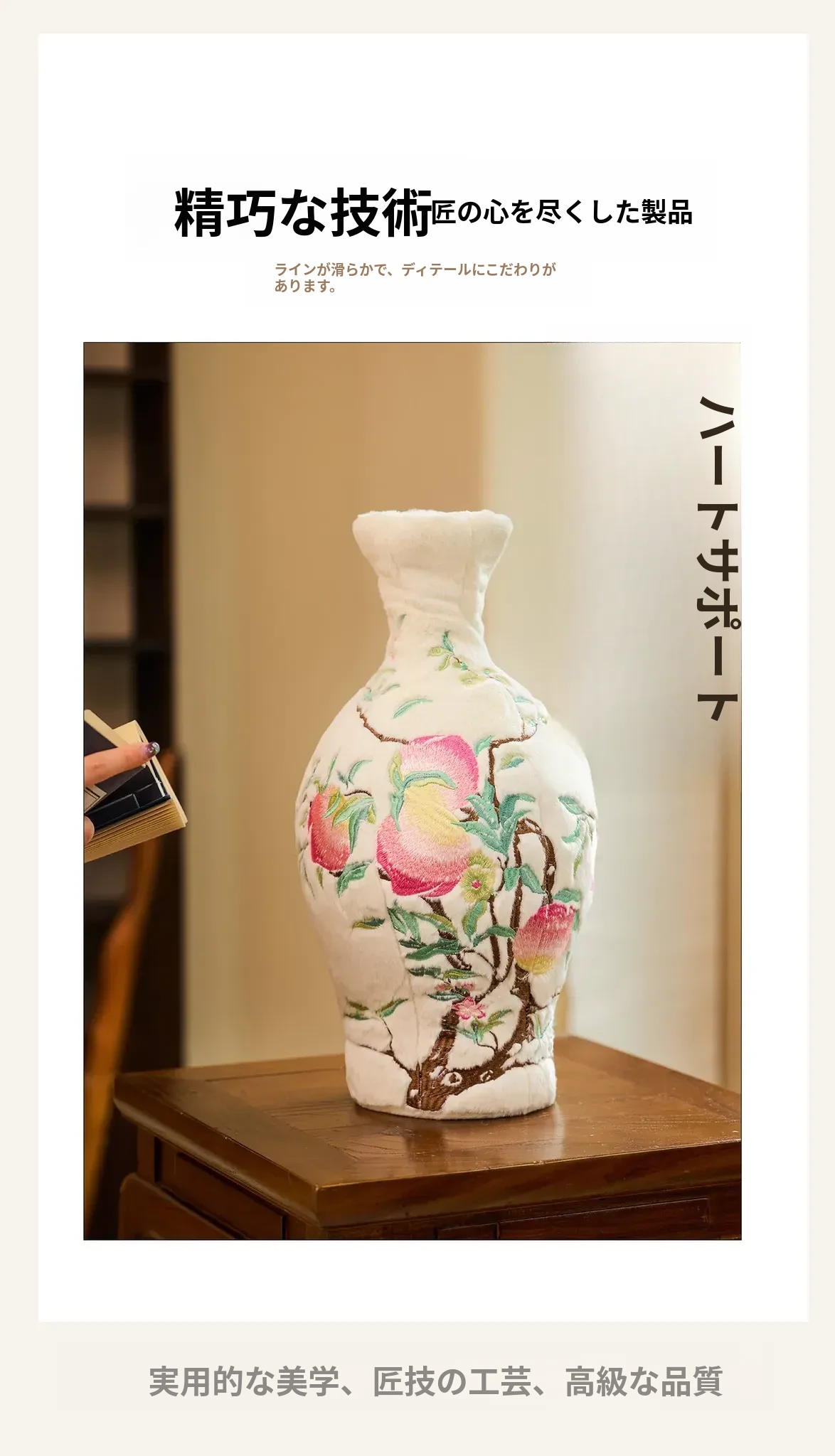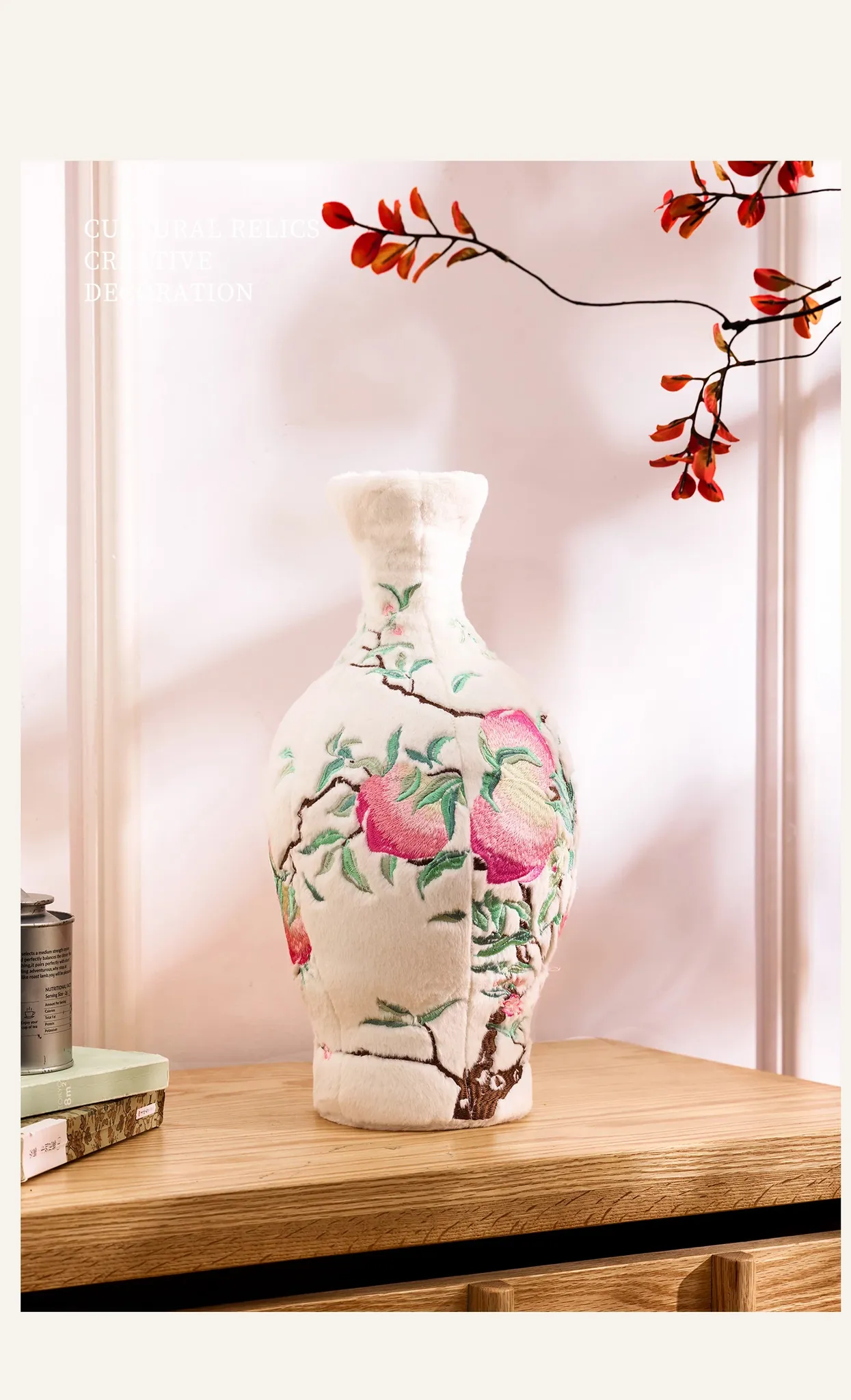 粉彩蝙蝠桃模様の瓶・ベルベット刺繍クッション・置物+ギフトボックス(瓶の直径20cm・高さ39cm)