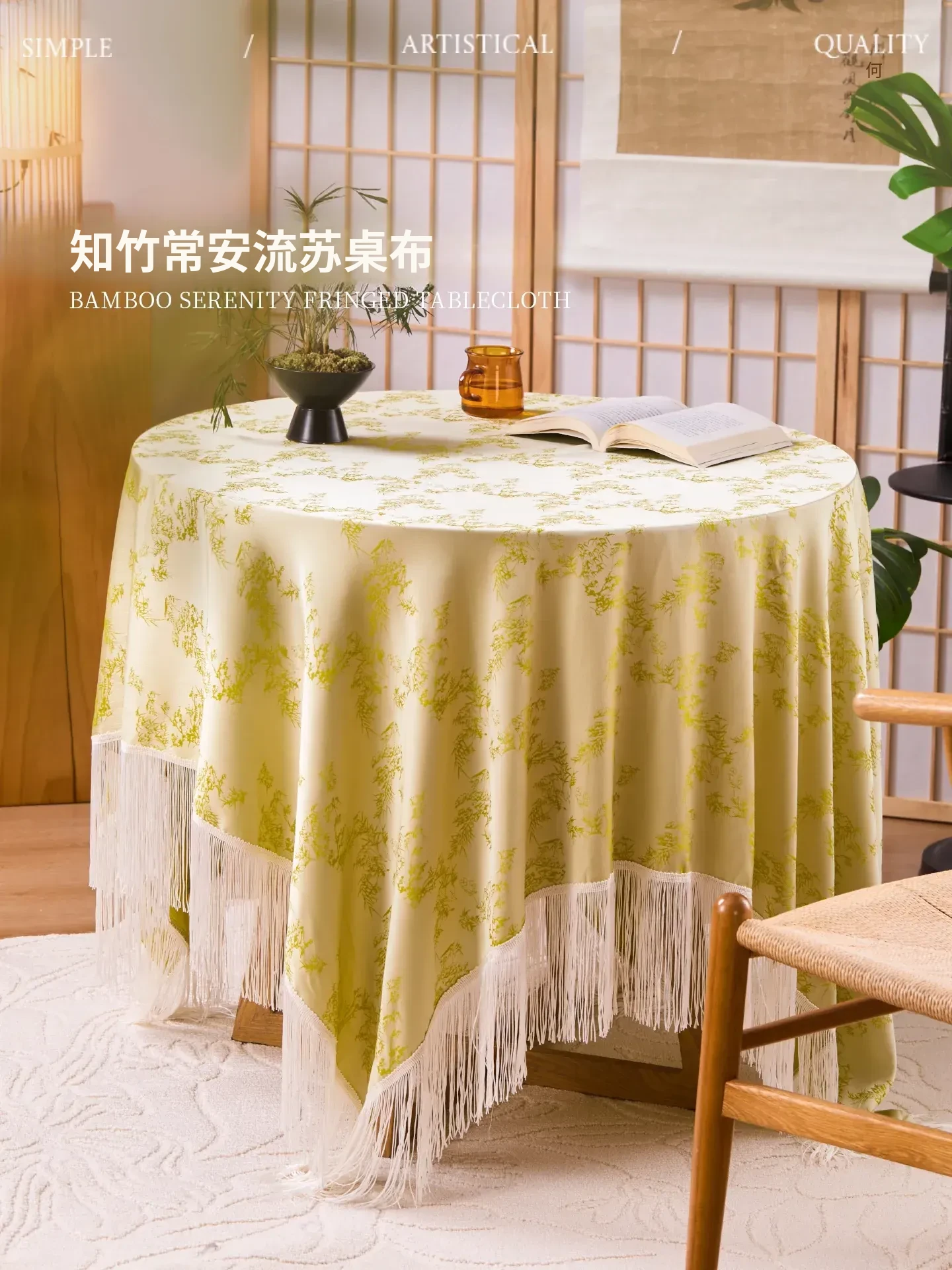 高級感あふれる中国風ラウンドテーブルクロス - 防水・防油機能付き、エレガントな雰囲気を演出するタッセル付きファブリックテーブルクロス。おしゃれなダイニングシーンを彩る一品!
