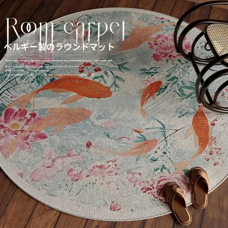 新中式スタイルのロッキングチェア専用ラグ - ヴィンテージ禅の雰囲気漂う円形マット、リビングルームにぴったり!防水・防汚仕様で高級感あふれるロッキングチェア用ラグ。