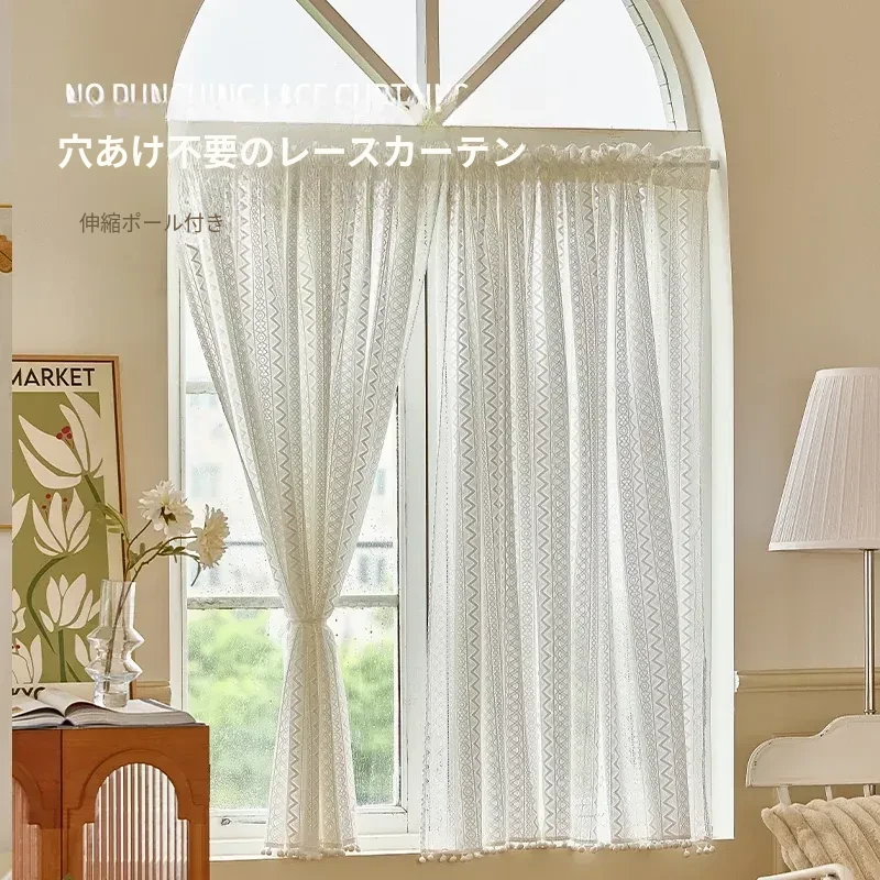 フレンチレースのクリーム色シアーカーテン、プルアップカーテンでおしゃれな間仕切り!寝室や小窓に最適な遮光・短めカーテンで、優雅な空間を演出します。お部屋を明るく、スタイリッシュに彩りましょう!