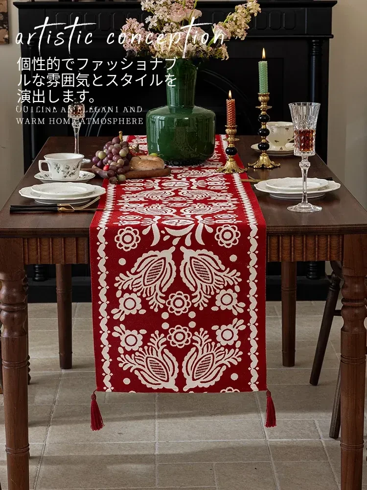 新中式スタイルの結婚式用リビングテーブルクロス - 深紅色で華やかな雰囲気を演出!高級感溢れる布製、ティーテーブル用カバー。お祝いの席にぴったりな軽やかな贅沢感をお楽しみください。