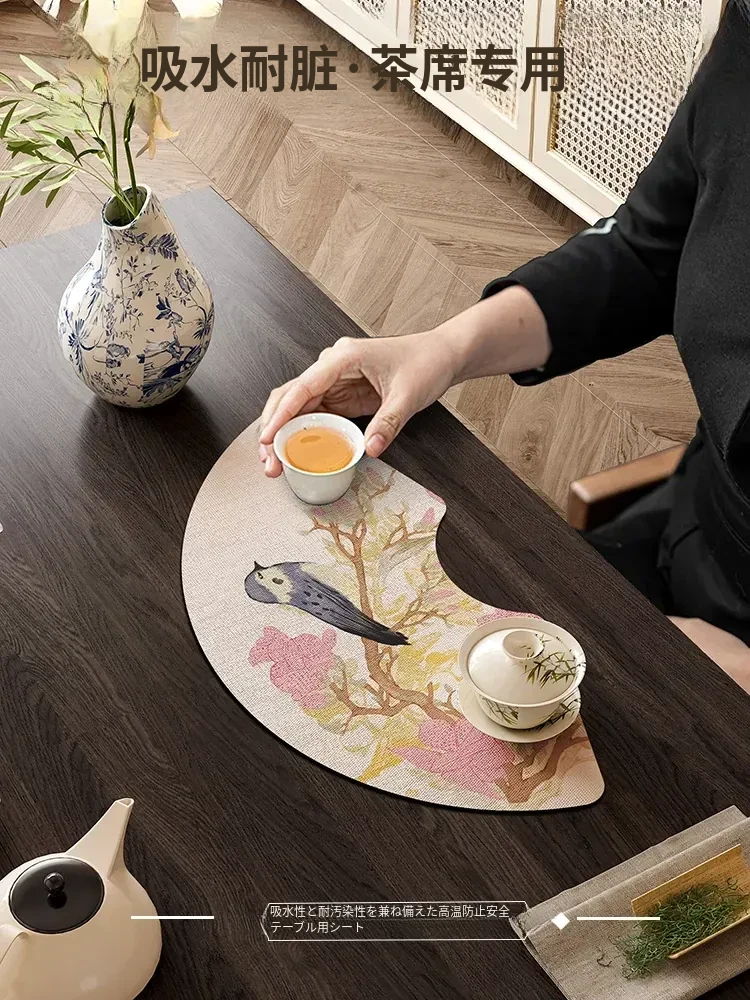 新中式禅の心を感じる扇形茶席マット、吸水性抜群のシリカゲル粘土使用!一人用のフレンチスタイルテーブルクロスで、優雅な茶の時間を演出します。お茶を楽しむための完璧なアイテムです!