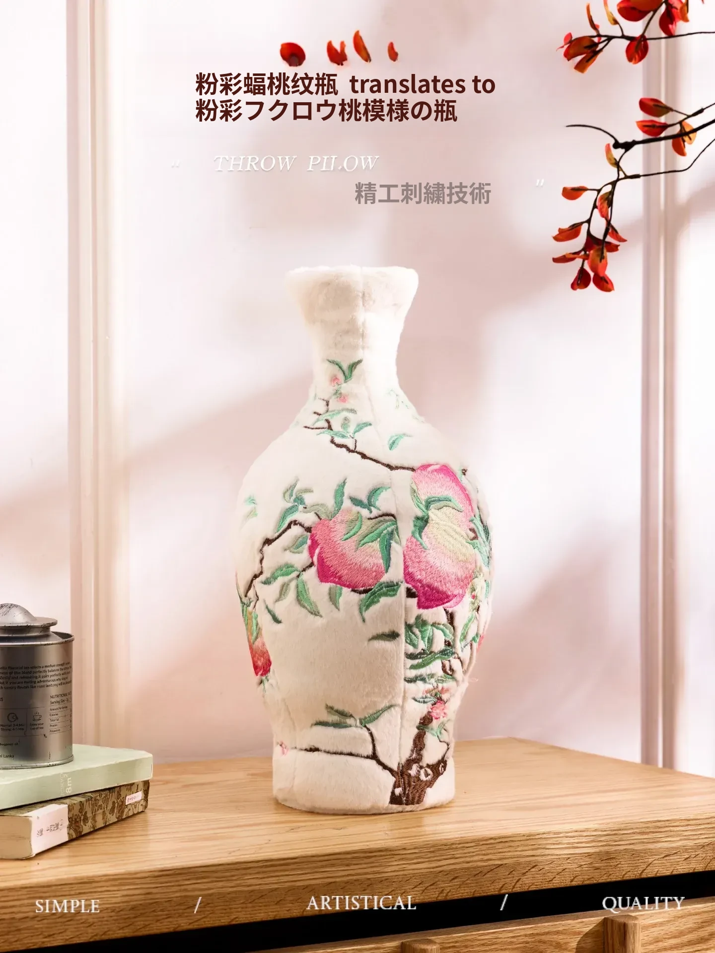 新中式蝠桃デザインの刺繍クッション、創造的な花瓶と背もたれクッションのセット – リビングや寝室にぴったりの中国風文創ギフトアイテム!おしゃれで温かみのある空間作りに最適です。