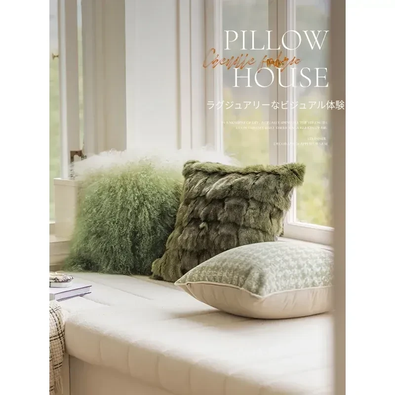 高級感溢れるウール製グリーン抱き枕|豪華なフォックスファーのクッションカバー|リビングやソファ、窓辺、ベッドサイドにぴったり!心地よい肌触りで、くつろぎの空間を演出します。